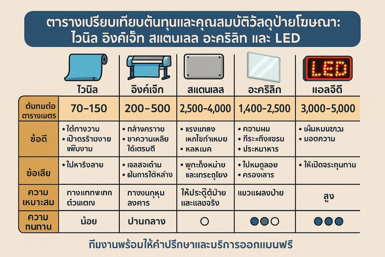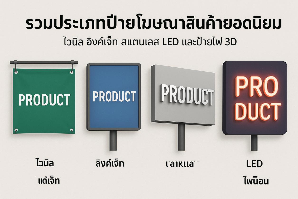 ประเภทของป้ายโฆษณาสินค้ายอดนิยม (ไวนิล, สแตนเลส, LED, อิงค์เจ็ท ฯลฯ)