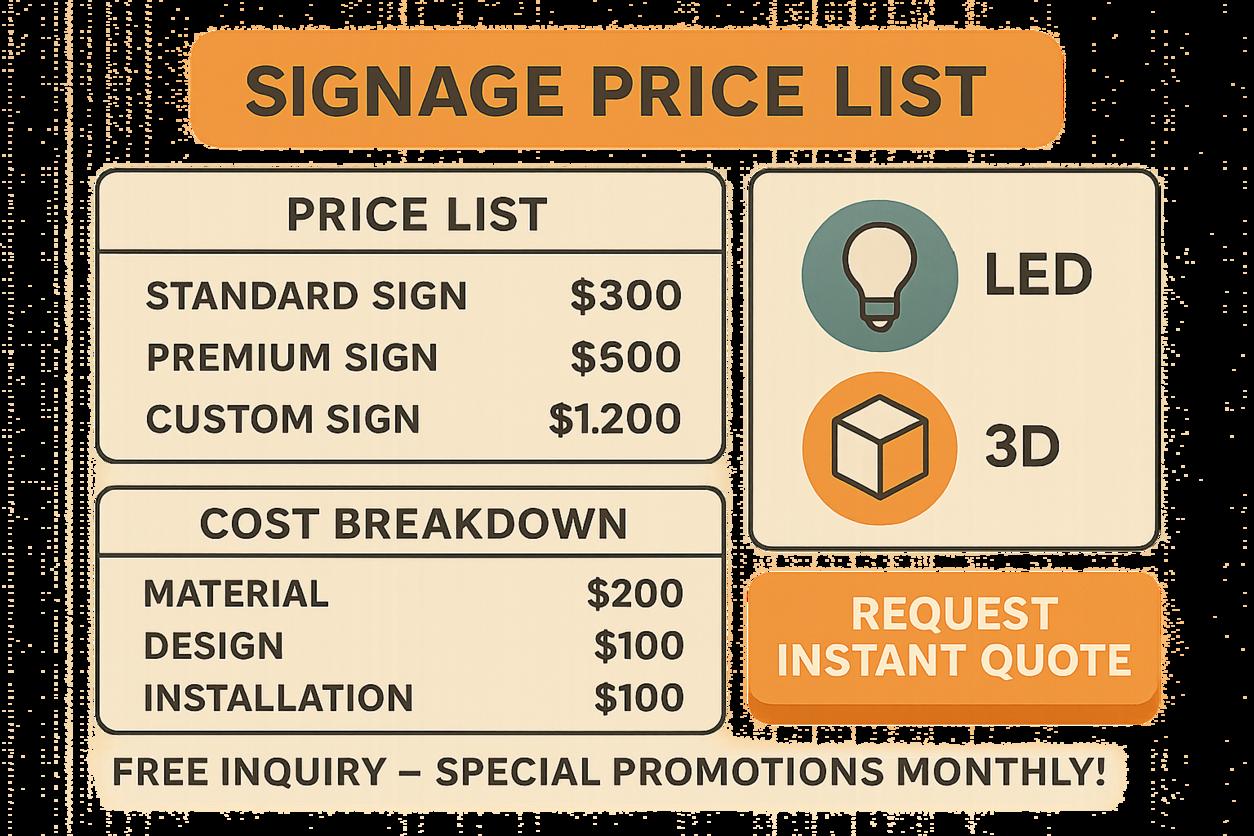 ดูตัวอย่างรายการราคาและรายละเอียดค่าใช้จ่ายของป้ายประเภทต่าง ๆ พร้อมบริการเสริม (เช่น LED, 3D) เพื่อช่วยให้ตัดสินใจได้ง่ายขึ้นได้ที่ คู่มือการเลือกป้ายโฆษณาเพื่อกระตุ้นยอดขาย คลิกปุ่ม “ขอใบเสนอราคาทันที” หรือ “ติดตามโปรโมชั่น” เพื่อรับข้อเสนอสุดพิเศษก่อนใคร