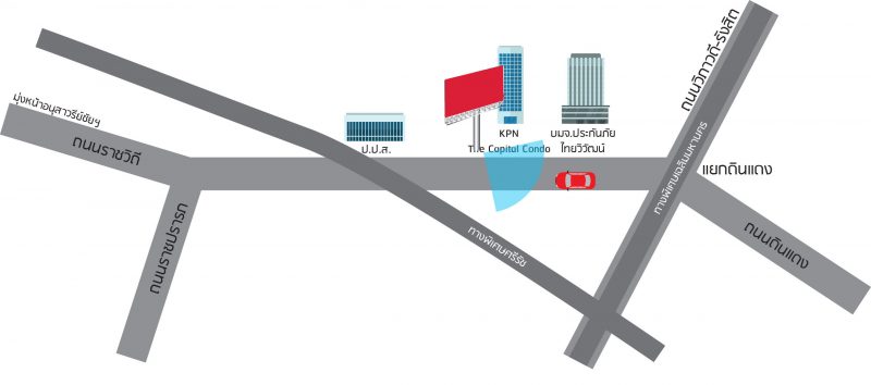 Detial : ป้ายบนอาคาร บริเวณถนนดินแดง ช่วงทางลงอุโมง ก่อนถึง ป.ป.ส. ป้ายหันรับรถที่มาจากแยกดินแดง มุ่งหน้าถนนราชปรารภ และอนุสาวรีย์ชัยฯ