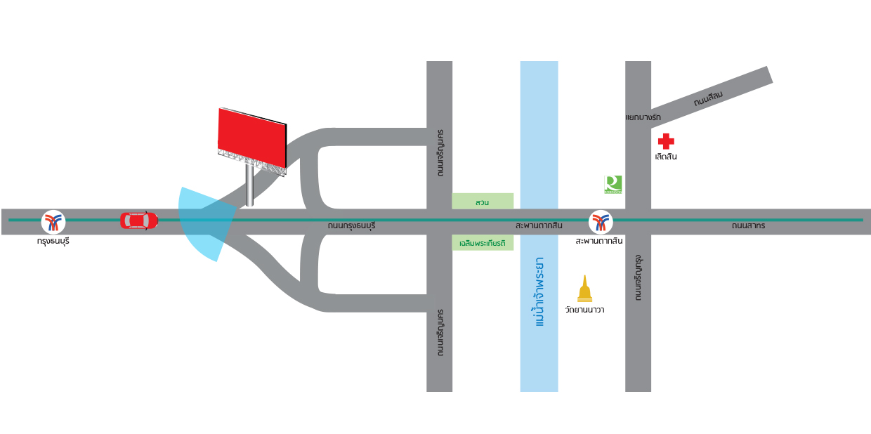 Detial : ป้ายบริเวณเชิงสะพานตากสิน ฝั่งถนนกรุงธนบุรี ป้ายหันรับรถที่มาจากวงเวียนใหญ่ ถนนกรุงธนบุรี มุ่งหน้าขึ้นสะพานตากสิน ถนนสาทร