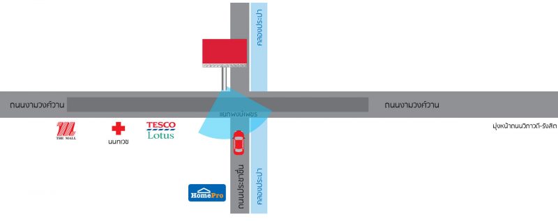 Detial : ป้ายอาคาร บริเวณแยกพงษ์เพชร ถนนงามวงศ์วานตัดถนนประชาชื่น ป้ายหันรับรถที่มาจากถนนประชาชื่น มุ่งหน้า ม.ธุรกิจบัณฑิตย์ ถนนแจ้งวัฒนะและรถที่เลี้ยวเข้าถนนงามวงศ์วานเพื่อมุ่งหน้าแยกแคราย และถนนวิภาวดีรังสิต